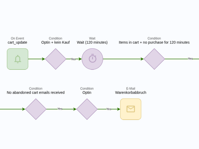Etwa 70% aller Online-Warenkörbe werden verlassen. Durch eine intelligente Wiederherstellungs-Logik kannst du diese “Low Hanging Fruits” zurückholen. Erstelle eine Automation, die bei einem “Add-to-Cart” Event greift, sofern ein Consent vorliegt. Lass deine Automation z.B. drei Stunden warten, und dann prüfen, ob seit dem letzten “Cart Update” Event kein Kauf getätigt wurde. Wenn das nicht der Fall ist (und immer noch ein Consent besteht), löst du die E-Mail aus, z.B. „Haben Sie etwas vergessen?“. Optimalerweise enthält die E-Mail einen Link der nahtlos zurück in den Checkout geht. Du solltest außerdem das Mailing einschränken, so dass es pro Kunde z.B nur einmal alle 7 Tage ausgelöst werden kann.