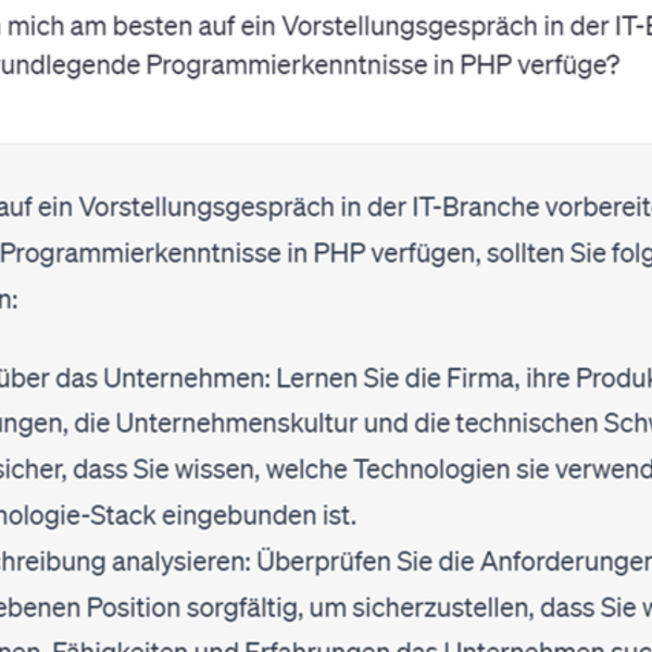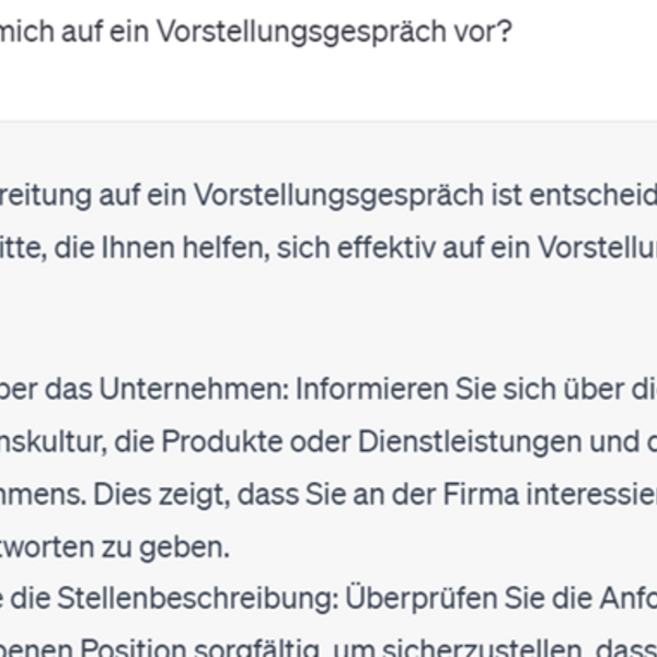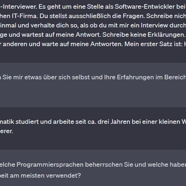 Nehmen wir an, Sie wollen für ein Bewerbungsgespräch üben. Bringen Sie ChatGPT dazu, als Interviewer zu agieren. Reichern Sie Ihre Prompts mit Informationen und weiteren Details an, anschließend können Sie ein Interview zu jeder Position simulieren. Sie müssen Ihren Prompt nur mit den Worten “Du bist …” oder “Verhalte dich als …” beginnen und dann so viele Details wie möglich hinzufügen.