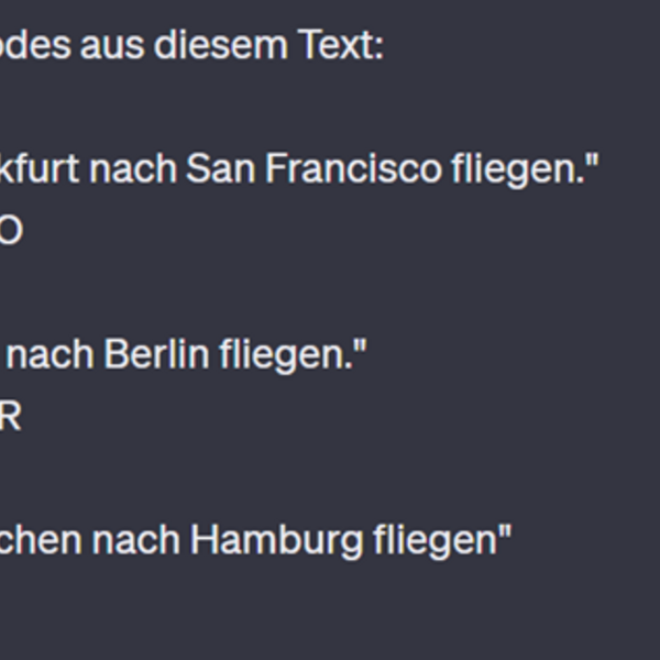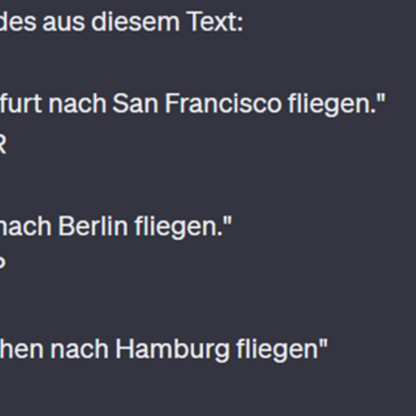 Lassen Sie uns einen weiteren Prompt erstellen. Angenommen, wir wollen Flughafencodes aus dem Text “Ich möchte von München nach Hamburg fliegen” extrahieren. Hier die Standardabfrage, die in den meisten Fällen verwendet wird:
