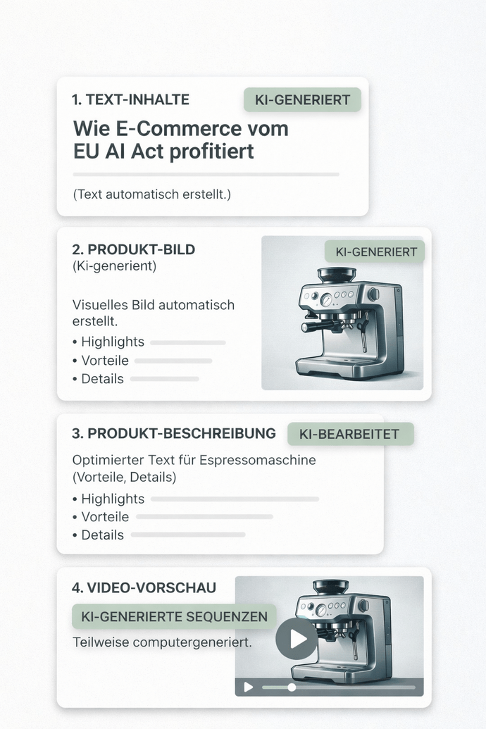 - ein sichtbarer Hinweis im Shop, im Beitrag oder im Medium, dass ein Bild, Video oder Text KI-generiert ist,