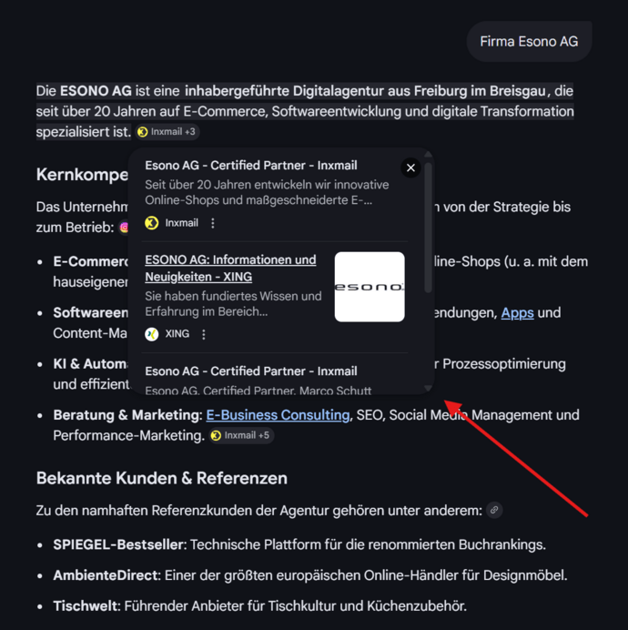 Google hat die Link-Darstellung in AI Overviews und im AI Mode sichtbar ausgebaut: Auf dem Desktop erscheinen Link-Gruppen beim Hover als Pop-up, inklusive Seitennamen, Favicons und Kurzbeschreibungen. Zusätzlich sind Link-Icons prominenter und klarer erkennbar gestaltet.