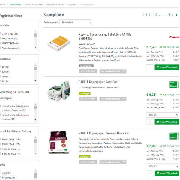 Auch für den Webshop von Streit für Büromaterial haben wir eine Elasticsearch Onsitesuche implementiert und konfiguriert. Hier werden aus den Produktdaten intelligente und automatisch generierte Filter ausgespielt. Der Filter wird komplett aus dem vorhandenen Datenmaterial erstellt und ebenfalls dynamisch aufgebaut. Ändern sich die Produktdaten, ändern sich die Suchfilter automatisch. Super, oder?
